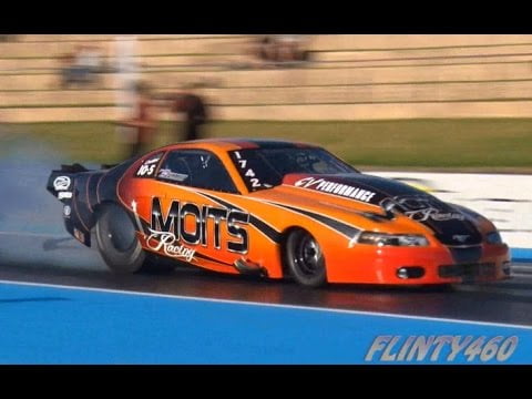Share Facebook Twitter LinkedIn Pinterest Email Paul Mouhayet in the MOITS RACING Twin Turbo Mustang running a 5.85 @ 402kmh defeating the N/A Pro Stock car running a 6.88 @ 316kmh.