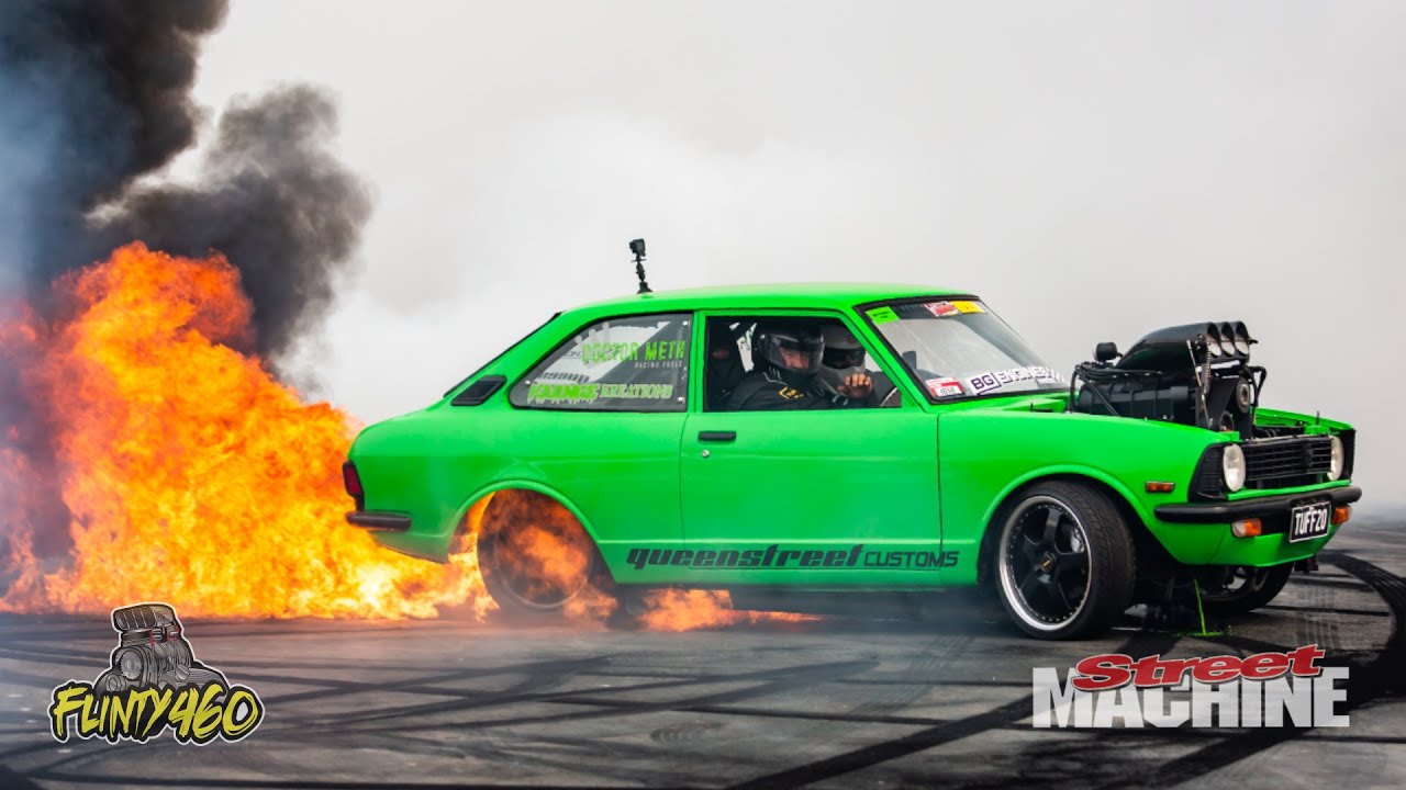 Share Facebook Twitter LinkedIn Pinterest Email Johno Murphy has a huge weekend at Summernats 33 in his Supercharged Corolla “TUFF20”. With 2 huge Tyre Fires during the Wildcard & Qualifying he ended the weekend suffering terminal damage to the engine with a few holes and dents in the sump…