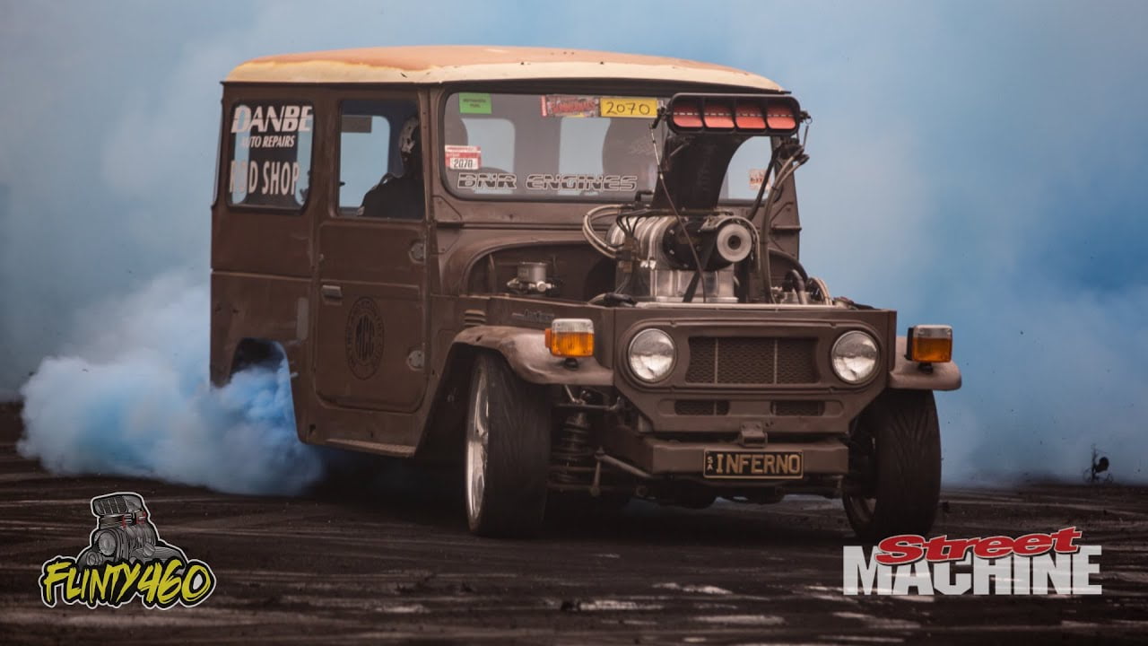 Share Facebook Twitter LinkedIn Pinterest Email Thomas Beltrame gets let off the chain at Summernats 33 in his Wild Blown Big Block Landcruiser “INFERNO”.