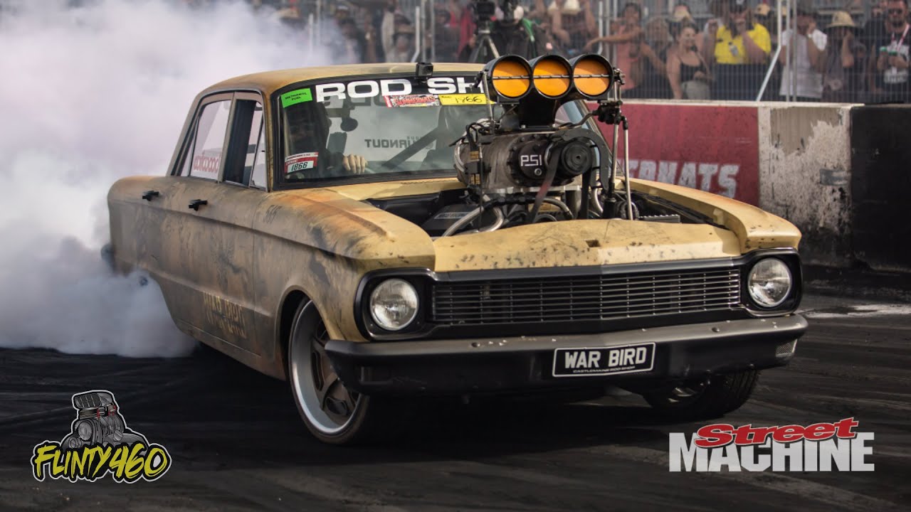 Heath Waddington punishes his Blown Injected 565 Cube Big Block Chev powered XP Falcon “WARBIRD” at Summernats 33. After scoring a Top 5 finish in the Wildcard Shootout he backed it up in the Masters Qualifying with a Top 10 finish to secure a spot in the final. Unfortunately a few bolts on the Oil Pump Drive failed resulting in an Oil Pressure drop, they shut the car down early to save the Engine. Turn the volume up and listen to this Insane Weapon..