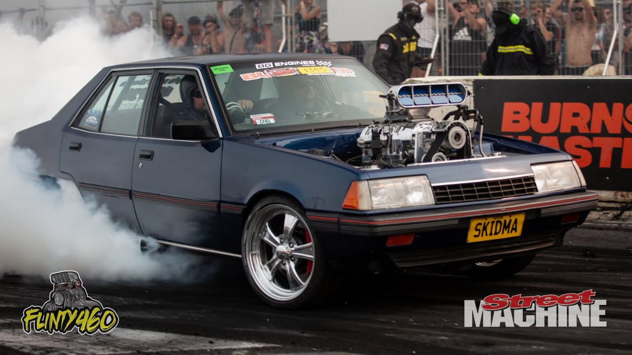Share Facebook Twitter LinkedIn Pinterest Email Adrian Cuthbertson tears it up at Summernats 33 in his Blown Small Block Chev powered Sigma. The car known as SKIDMA is deafening and easily one of the Loudest cars to hit the Burnout Pad.