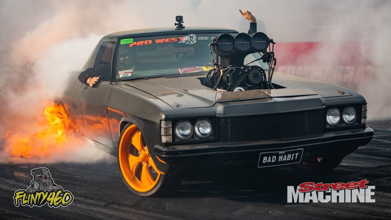 Share Facebook Twitter LinkedIn Pinterest Email Sam Lord suffers a few tyre fires at Summernats 33 in his Blown Big Block Ute “BAD HABIT”.