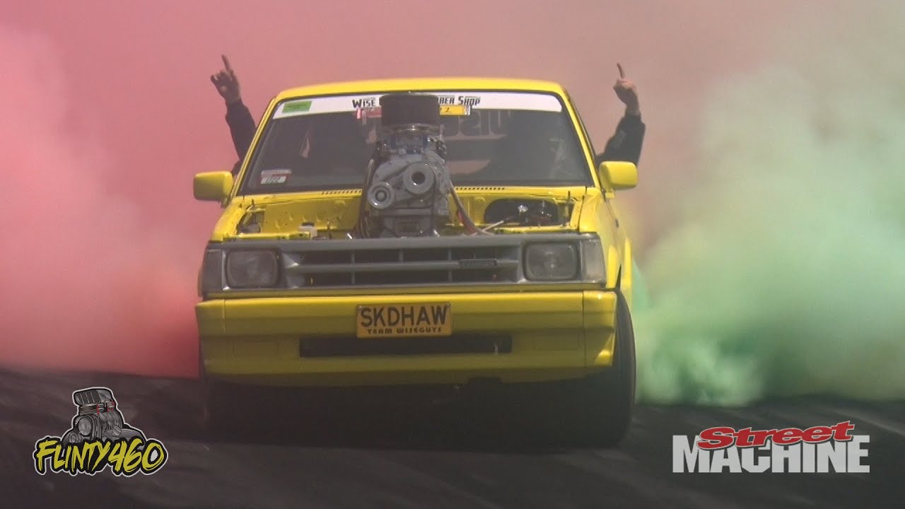 Share Facebook Twitter LinkedIn Pinterest Email Mitchell Hawes starts strong at Summernats 33 in his Blown LS2 Ford Courier, unfortunately the wheel studs snapped resulting in the wheel coming off before he reached the Centre of Burnout pad.
