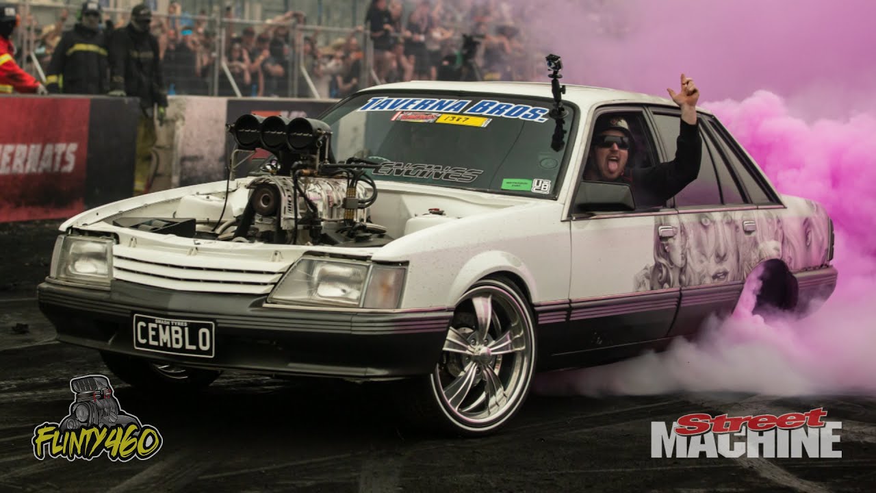 Tim Brown managed to score 1 of 10 spots into the Burnout Masters Final in his Supercharged VK Commodore “CEMBLO” with a clinical display during qualifying.. During the finals he managed to smoke himself out and tag the wall as well as nose into the Wall.. Turn up the Volume and listen to this Small Block Chev get punished.