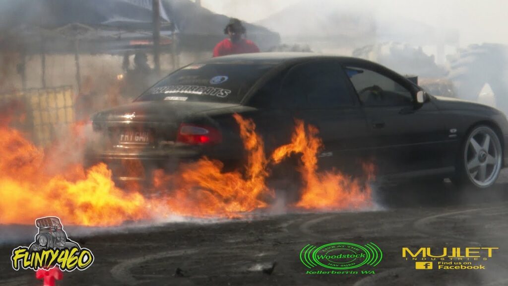 Share Facebook Twitter LinkedIn Pinterest Email Jack Proudfoot has a HUGE Tyre Fire at Woodstock Kellerberrin in his “FRY GMH” Commodore.