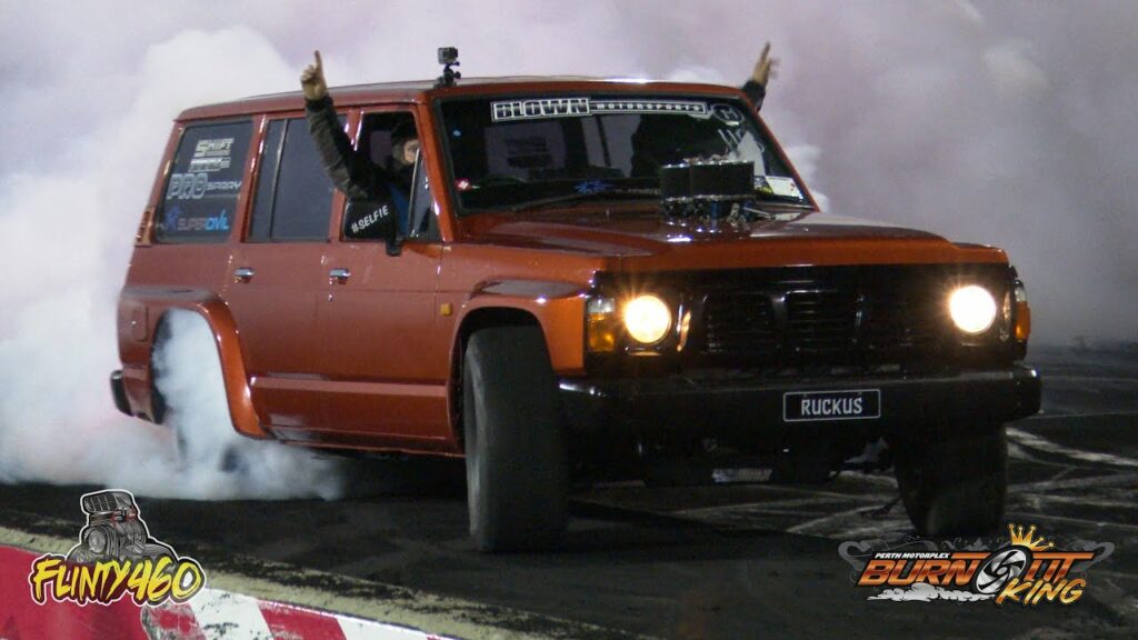 Share Facebook Twitter LinkedIn Pinterest Email Jason Fletcher returns to the Snakepit at Burnout King in his LS Powered Nissan Patrol “RUCKUS”.