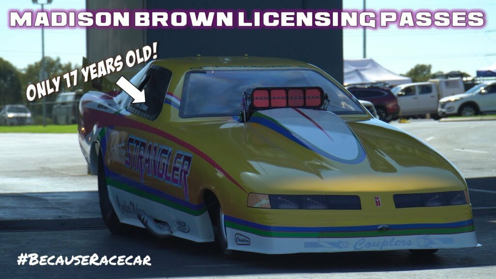 The car is a 1992 Oldsmobile Cutlass Funnycar that was brought over from America by the Lush Brothers from Applied Automotive in Maddington and raced by Madison’s Dad (Ian) 22 years ago, it runs a 526ci Keith Black Hemi with a 16-71 Littlefield Blower on Methanol. The car has PB’d with a 6.01 @ 233mph (380km/h) with a 0.985 60ft. Madison has already managed to go 1.01 in the 60 which is just incredible!!