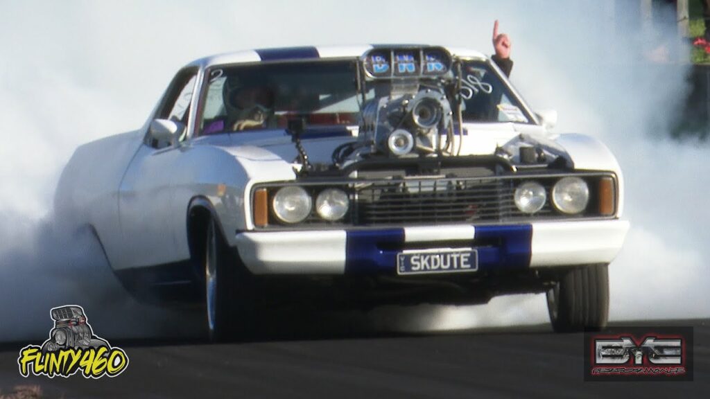 Share Facebook Twitter LinkedIn Pinterest Email Steve Edsall with a clinical Burnout Qualifyer at Brashernats in his Screaming Supercharged Small Block XC Ute “SKDUTE”..