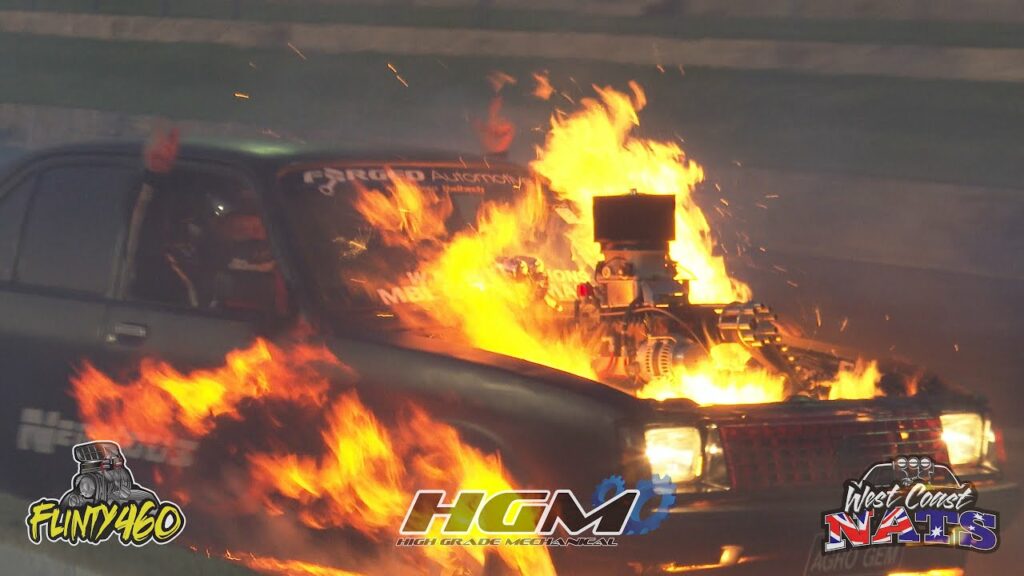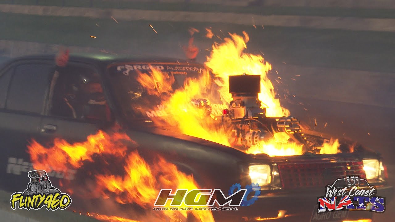 Share Facebook Twitter LinkedIn Pinterest Email Andrew Corlett takes the “RODNEY” Trophy at West Coast Nats with this Spectacular Explosion on Friday Night in his Supercharged V6 Gemini “AGROGEM”.