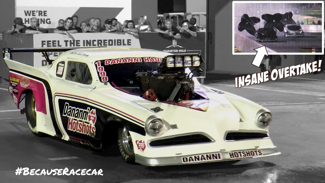 The highlight of the night was hands down the wall tap in the Kelvin’s Mustang followed by a pretty spectacular overtake under parachutes in the braking area somehow managing to steer the car like an absolute pro between the outside of Stu Moresby and the wall (in Stu’s lane) and pulling both cars up safely. I can’t say that we see that very often.