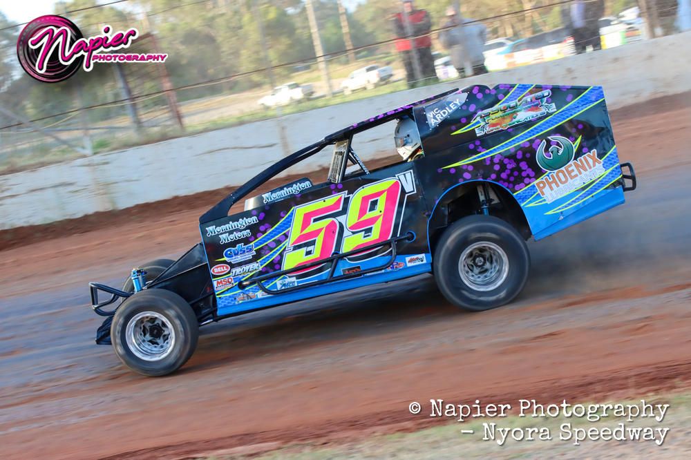In Modified Sedan feature action on Sunday night a competitive field that includes Victorian champion Kye Walters from Geelong will be in action. Walters will have stiff competition from Nick Cockerill, Ty Galley, Lucas Conder and Darcy Wilson to name a few whilst Nyora is very well represented as the interest locally to run Modified Sedans continues a regrowth. The Reddecliffe brothers Marcus and Matt, husband and Wife John and Trish Dike and Dale Hallett will be all keen to pick up the first feature win for a Nyora registered Modified competitor for some time.