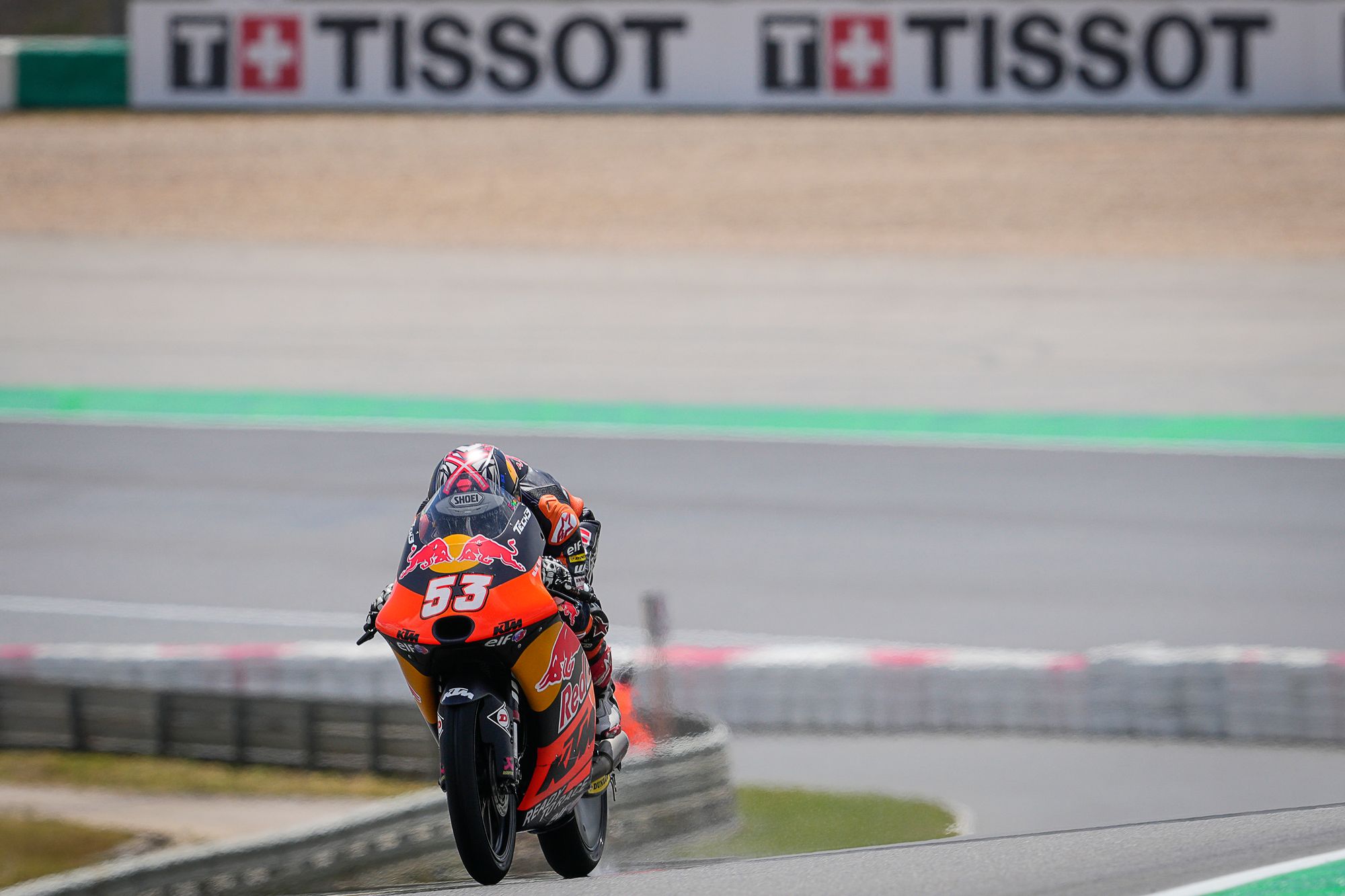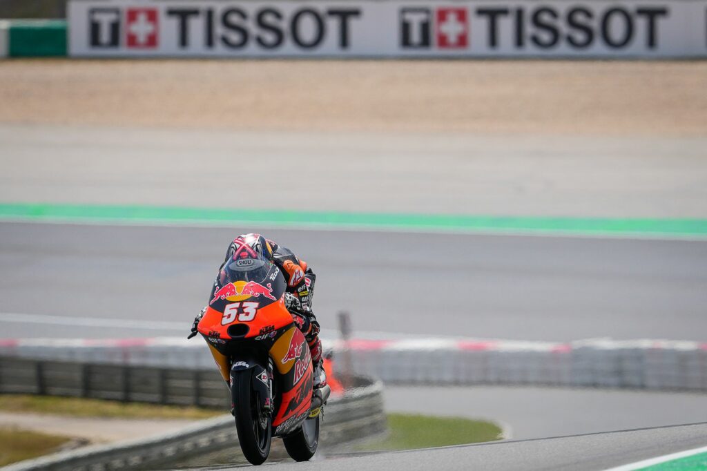 Red Bull KTM Tech3’s Deniz Öncü has taken a second career pole position after a stunning qualifying at the Grande Premio Tissot de Portugal, timing his final flying lap to perfection. Having come through a wet Q1 earlier, the Turk made the most of improving track conditions to take top spot as the chequered flag came out and, in doing so, denied both Mario Aji (Honda Team Asia) and Lorenzo Fellon (SIC58 Squadra Corse) debut poles.