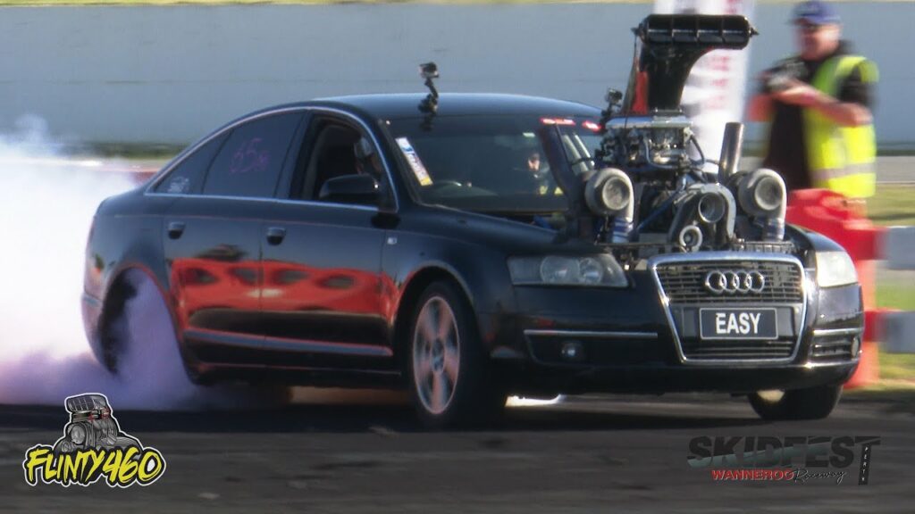 Peter Mountain recently debuted his Insane Twin Turbo and Supercharged Audi “EASY”. It’s certainly made an impact and to add to the spectacle he’s added a Carbon Hat to the Twin Carb set-up. It wasn’t his day yesterday with the carby issues cutting both skids short.