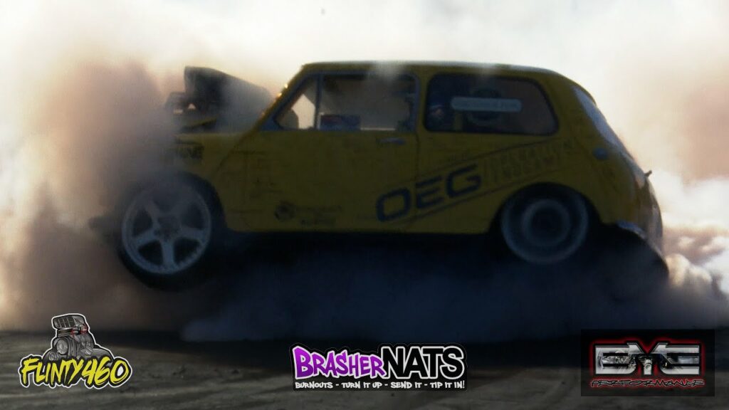The Operation End Game Tubshp Mini almost rolls over on an Exhibition Burnout at Brashernats. The Blown Injected Mini was actually taking an auction winner for a passenger ride when the Tip-in came in a little hot.