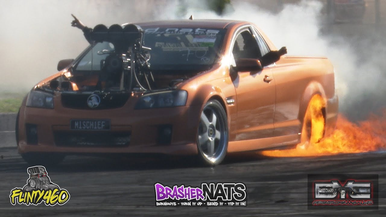 Share Facebook Twitter LinkedIn Pinterest Email Tristan Lee-Madgwick doesn’t each reach the Brashernats Burnout Pad and his Blown Injected ute “MISCHIEF” is already on Fire. The Fire Crew quickly extinguished the fire only for the car to light up again.