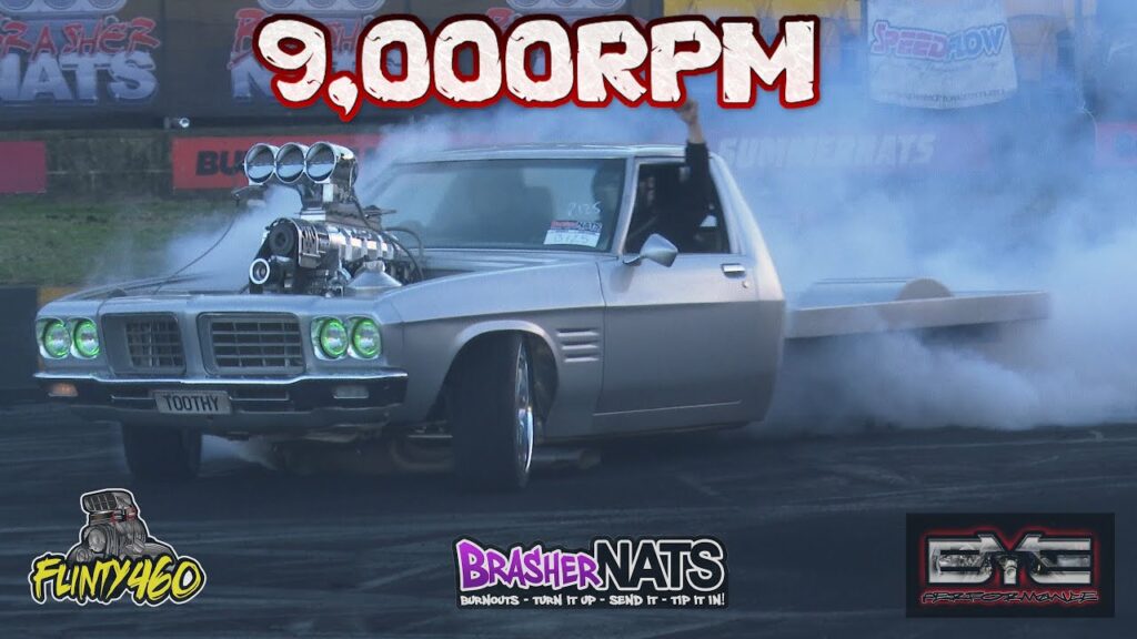 Share Facebook Twitter LinkedIn Pinterest Email Martin Tooth brings the Revs to Brashernats in his Supercharged 320 Cube LS powered HQ Ute “TOOTHY”. After an awesome qualifying skid and a Fire as he drove off the Pad he returned for the Finals to punish the Small Cube LS once again.
