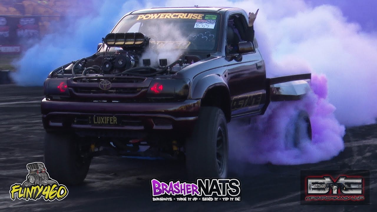 Share Facebook Twitter LinkedIn Pinterest Email After an awesome 8,000+rpm Burnout during qualifying, the Supercharged LS Hilux “LUXIFER” snaps the Converter Bolts early on during the Final.