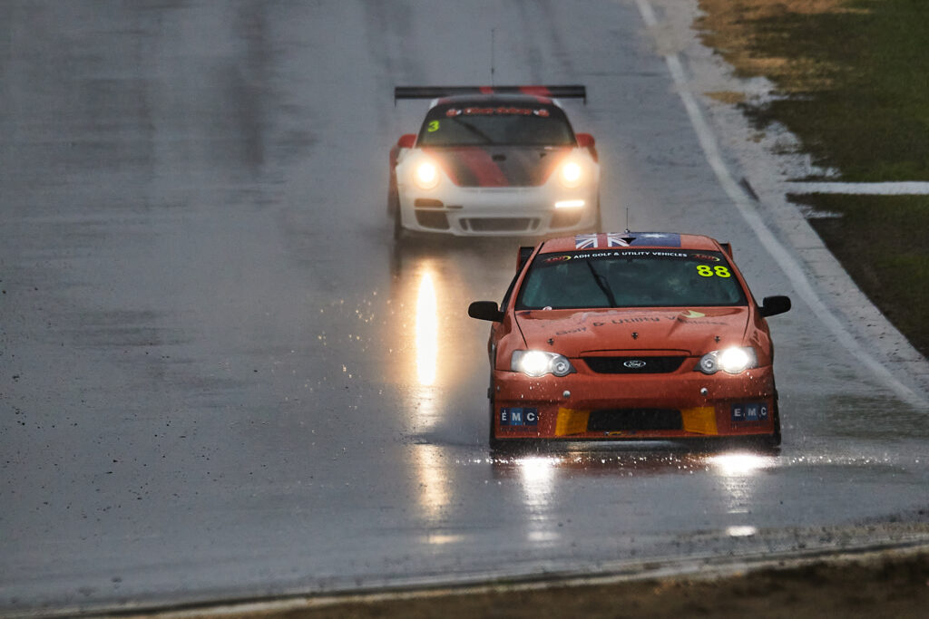 In the third race, the Porsche 997.2 of Walter Epple was holding a commanding lead over the Ford Falcon BF of Grant Hill until the latter finally got him at the top of the hill leading down into Turn 6.