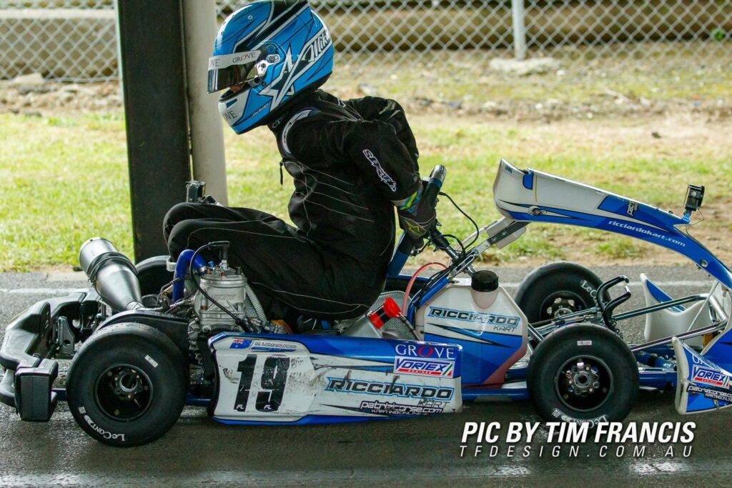 Queensland state champion Xavier Avramides was the final driver to hit the track in KA4 Junior Light. Avramides qualified on the front row of the grid aboard the all new Ricciardo Kart AR28 junior kart and never left the top 3 on Saturday with a brilliant position 3 in heat 1 and position 2 in heat 2 in an epic battle for victory. Xavier backed up his fast start to the weekend with position 4 in heat 3. Avramides took the lead in the final and looked a huge chance for victory when a mid-race contact took him out of contention, robbing him of a potential City of Melbourne title!
