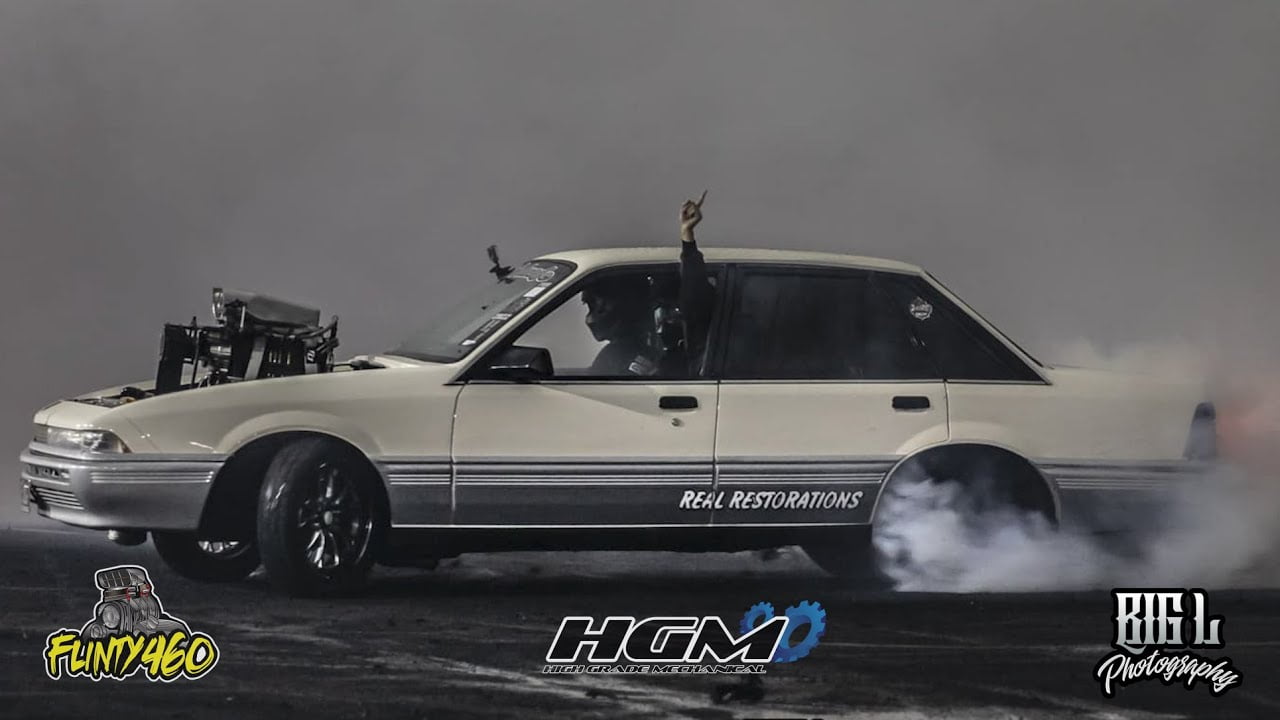 Chris Orchard switches out the old LS for a Blown Injected BNR built 307 Cube Small Block Chev in his VL Sedan “THE OG” and probably takes the award for the loudest car at West Coast Nats. Everytime he hit the loud pedal it was deafening, and with a heavy right foot and some quality wheelwork he laid down 2 awesome demonstration burnouts.