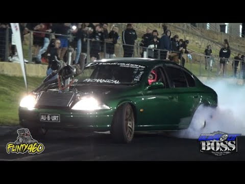 Share Facebook Twitter LinkedIn Pinterest Email TWIN TURBO AU FALCON “AU-B-HURT” SMASHING TYRES AT BURNOUT BOSS