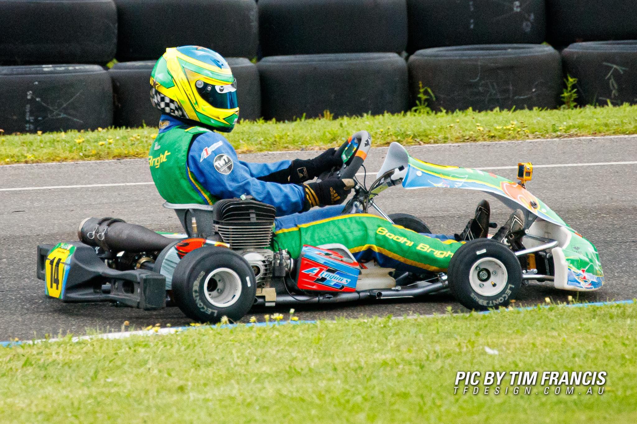 Bodhi hit the track in the KA3 Senior Medium class and was right in the fight for pole position setting the 3rd fastest time of the session to put him on the 2nd row of the grid. Bright had a mixed opening 2 heats with a brilliant victory in heat 1 but was disqualified from heat 2 while leading the race due to a sidepod coming loose. Bodhi was off position 9 for the 3rd and final heat and he put in a stellar performance to move up 5 spots into 4th spot. Bright was starting out of position 6 for the final and quickly moved his way into the top 5. Bodhi made his way further up and was right on the verge of the podium positions and crossed the line in an excellent 4th position overall!