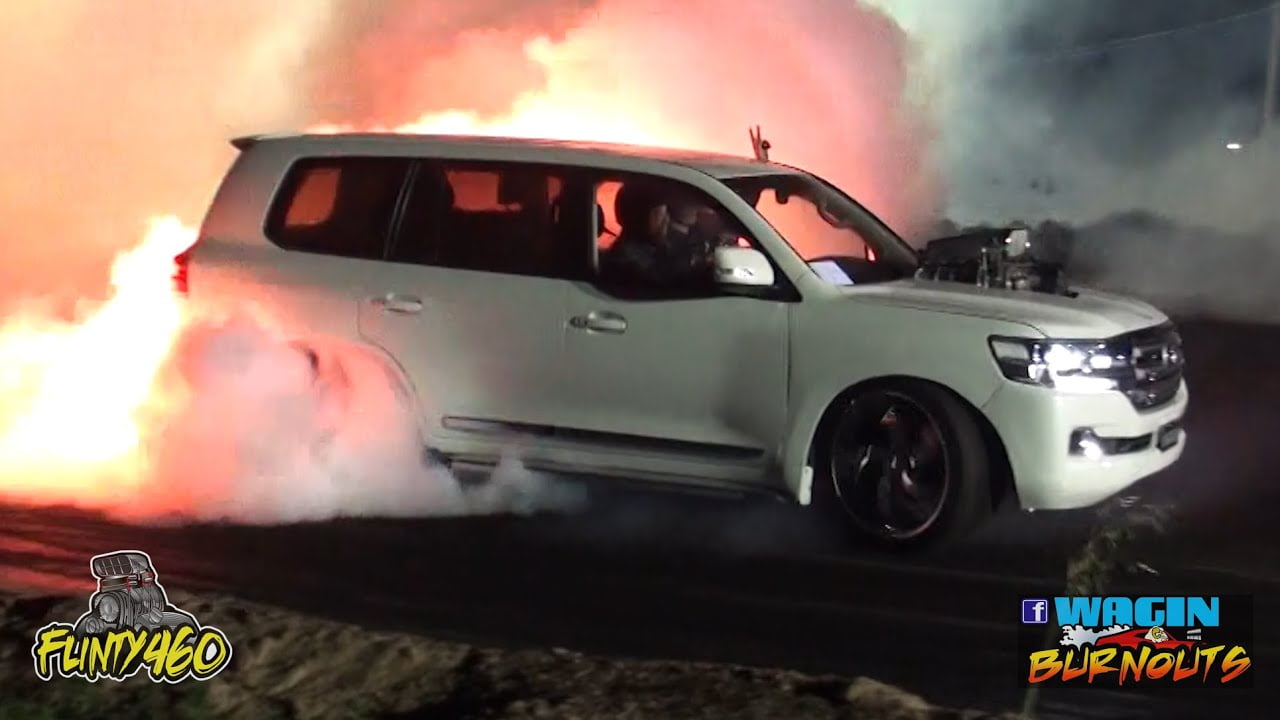Share Facebook Twitter LinkedIn Pinterest Email Colin Byrne smashes a set of tyres and has a small Tyre Fire at Wagin Burnouts in his Blown Injected Big Block Chev powered Toyota 200 Series Landcruiser “KING CRUZA”.