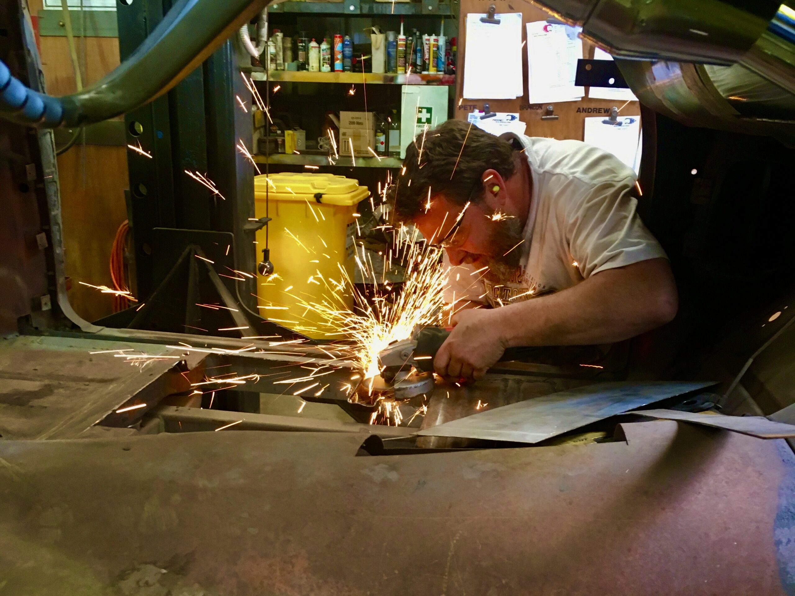 Plenty more to see at the front too, the bonnet swage has been set to with a brickies bolster chisel and hammer to sharpen and define. When pressed for details, Stew admitted that the hammer was not used suggestively for the task. Then the front and rear splash pan and bumpers have been shrunk fit closer together for a nice snug fit.
