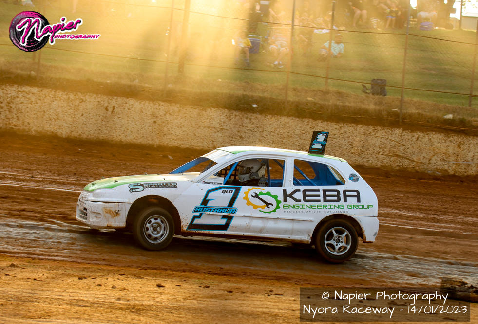 In Junior Sedan action, twelve heat races prior to the feature event determined where racers would start in the title race final. Kiarna Barton from Bittern won the first race of the evening with Hunter Downs from Western Australia the next race in the fastest heat race time of the evening of three minutes twenty-five seconds. Aidan Rigby started well with a win as did Jaiden Santin from New South Wales.