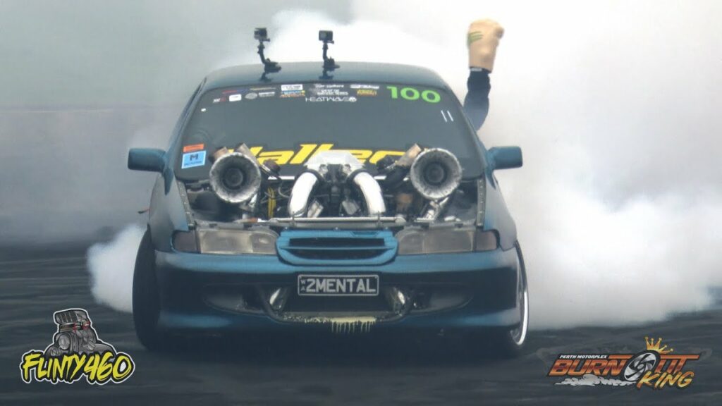 Chad Douglas lays down an impressive skid at Burnout King as he continues to fine tune his Insane Twin Turbo LSX VG Ute “2MENTAL”. With a heap of speed carried around the pad, a slight miscalculation resulted in a Wall Tap.