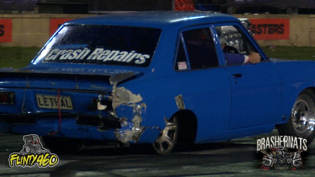 Within seconds of hitting the loud pedal in his Blown Injected Datson 1200 it’s taken a sharp turn and smacked the wall & tyre REALLY HARD!! Not to be deterred, Ben’s stays on it until the tyres are gone, at which the damage to the rear of the car is quite extensive.