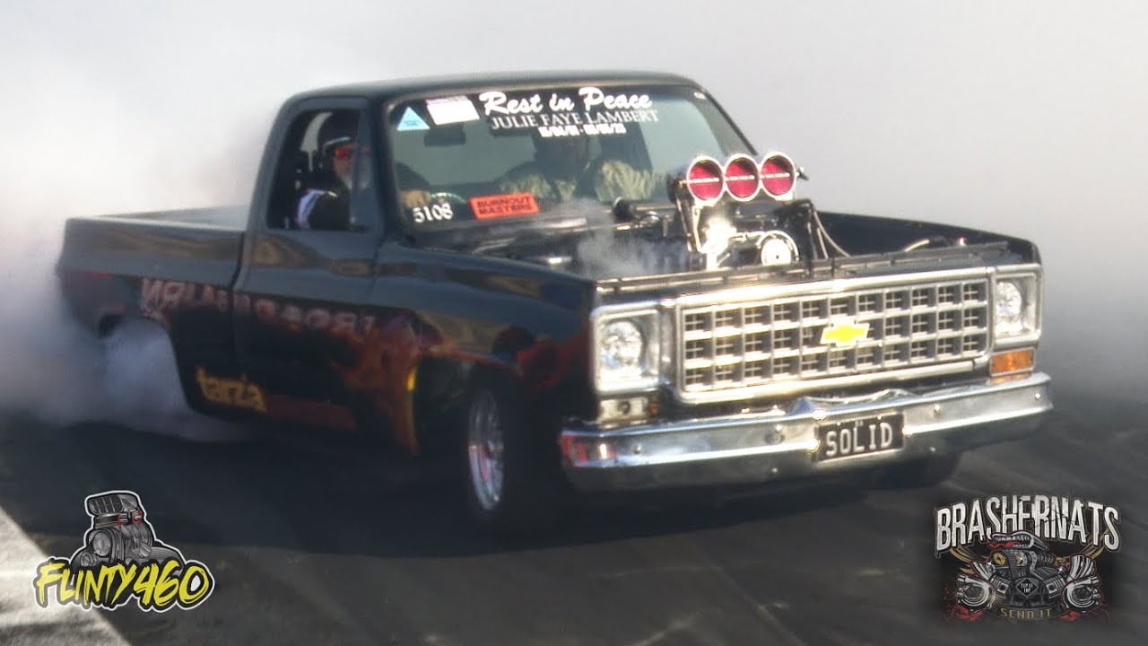 Share Facebook Twitter LinkedIn Pinterest Email Danny Smith takes to the Brashernats Burnout Pad in his Blown Injected Big Block Chev C10 Truck “SOLID” and smokes out the joint.