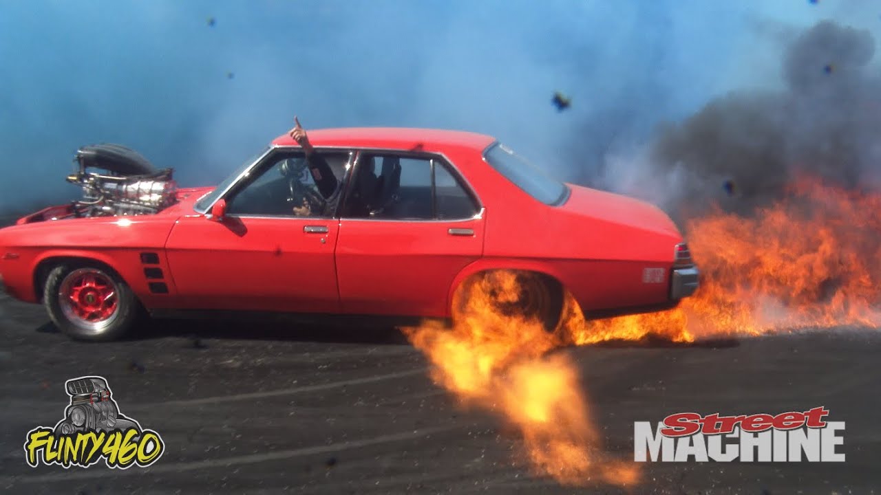 Share Facebook Twitter LinkedIn Pinterest Email Dom Luci debuts his fresh Blown Combo at Summernats 36 and lights the rear of the car on fire during Burnout Qualifying.