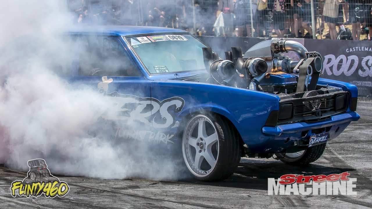 Share Facebook Twitter LinkedIn Pinterest Email Ben Bolton blows the Charge Pipe off his Twin Turbo & Supercharged Barra Cortina “OVERKILL” mid-burnout at Summernats 36.