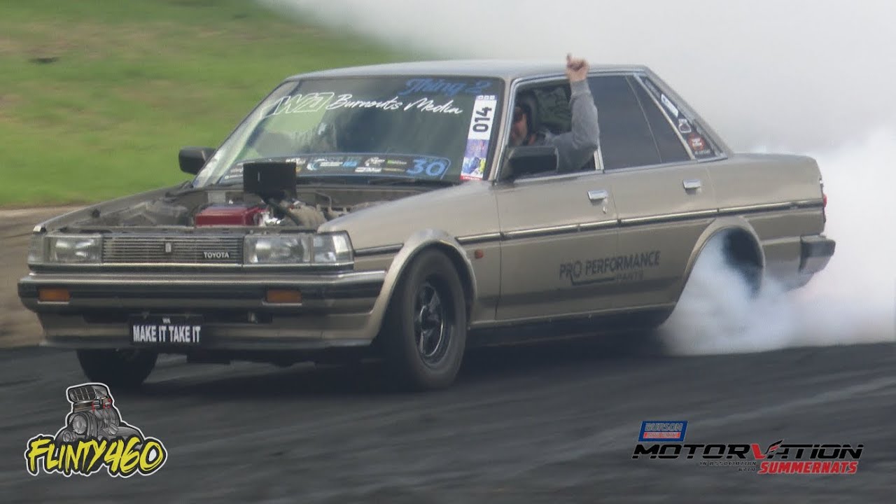 Share Facebook Twitter LinkedIn Pinterest Email Mark Bell takes the Sportsman Class Win at Motorvation 38 in his Barra powered Toyota Cressida with two awesome wheelwork displays.