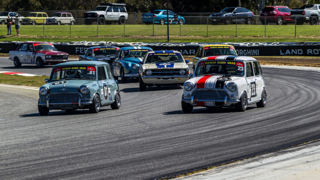 Race 3 and Rayner would continue his dominance of the overall Historic Touring Car Results with Pisconeri and Barr behind. In the Morris Cooper S field of 10, Cono Onofaro would be the best of the bunch with Jason Armstrong from South Australia and Dan Forster coming in behind. Nicholas Swift had an unfortunate DNF in the race.
