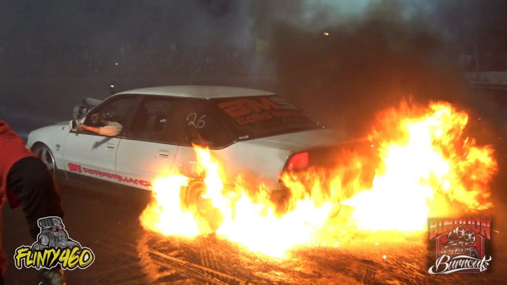 Gavin Van Breukelen toasts the back end of his Blown EFI Stato “FLACCID” a couple of times at Bindoon Burnouts, this was after hitting the wall during his first qualifying skid. Needless to say, after the wall hit he didn’t really care what happened.