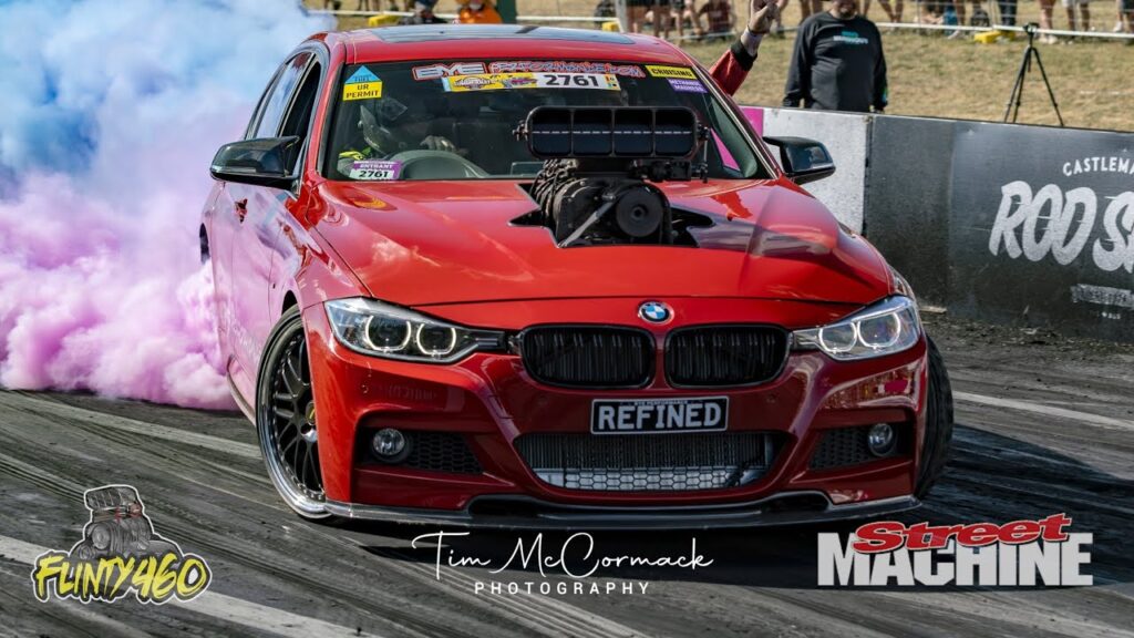 Justin Pitsikas tags the wall in his Blown EFI BMW “REFINED” during the Summernats 37 Pro Burnout Series Qualifying round.