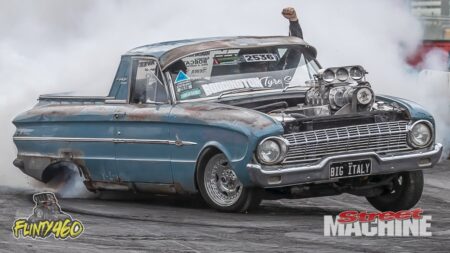 Chris Orchard takes on the Burnout Masters qualifying round in his Blown Injected Big Cube VF Commodore “GAMEOVER”. Everything was tracking along nicely until a Pinhole in a plug lead resulted in an early exit to save it for another day.