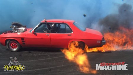 Dom Luci debuts his fresh Blown Combo at Summernats 36 and lights the rear of the car on fire during Burnout Qualifying.