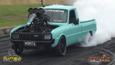 Jamie Ball has a Close Call with the Wall at Burnout King during the Final, with a huge Tip-In speed he carried the skid right to the end of the Snakepit and only missed the wall by very small margin. Not to be deterred, he reversed and smashed the Loud Pedal in his Supercharged EFI Ute “SHITTORQUER”.