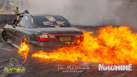 Aaron Schilg lights up the Summernats 37 Burnout pad with a Massive Tyre fire from his Blown Commodore “2IMPRES”.