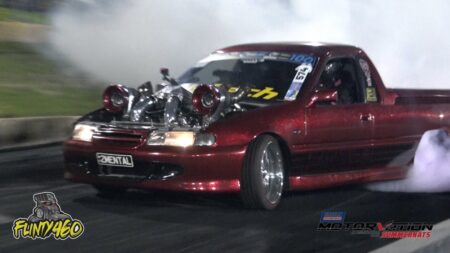 Tom Hooper destroys the Burnout Pad during Motorvation qualifying in his Blown Injected Big Block Chev powered ute “NOT BAD”.